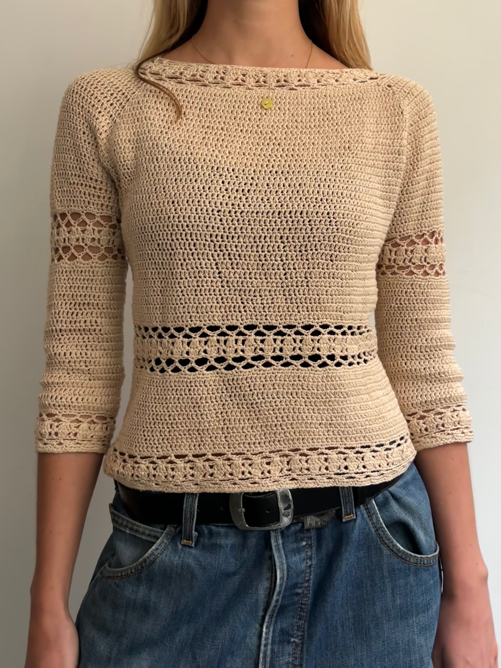 Cream crochet jumper with small mother of pearl flower charm detail.